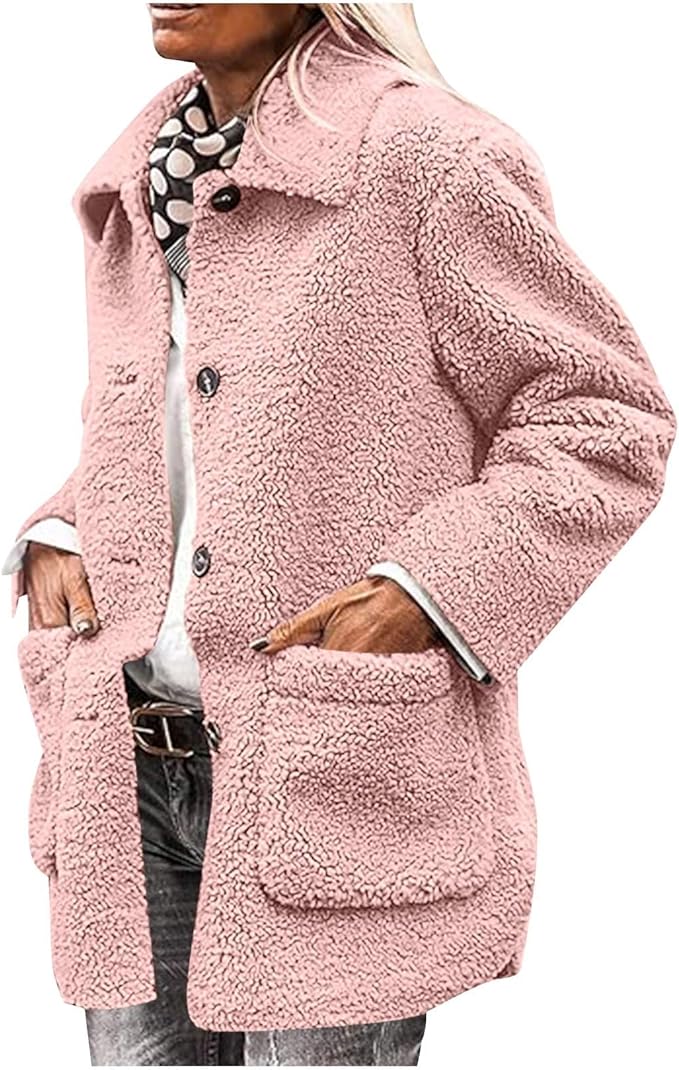 2023 Women's Fashion Fuzzy Fleece Short Jacket Fall Winter Lapel Button Down Outerwear Long Sleeve Faux Fur Coat