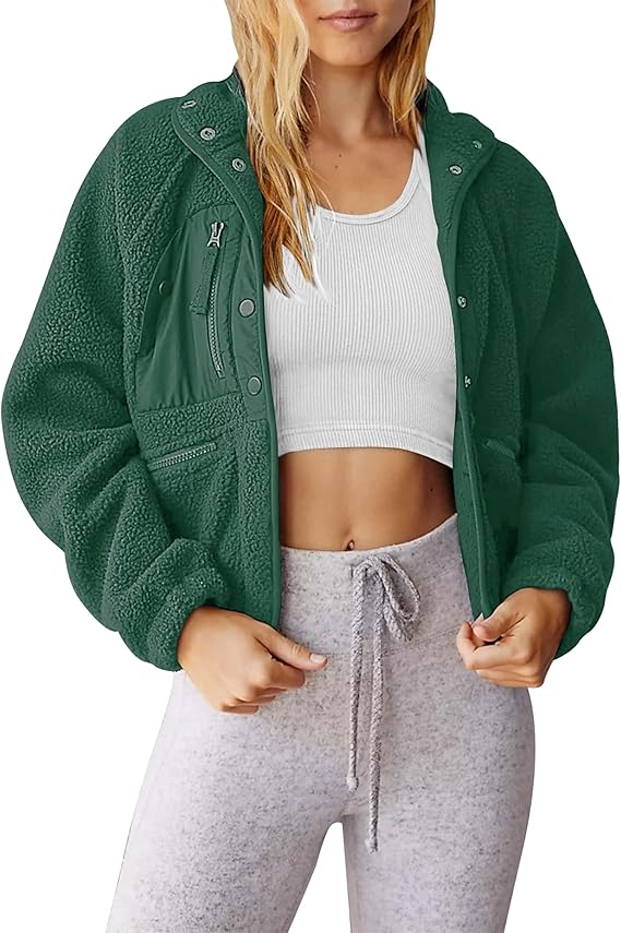Lightweight Cropped Fuzzy Fleece Jacket for Women Winter Warm Sherpa Jackets Coat Outerwear with Pockets