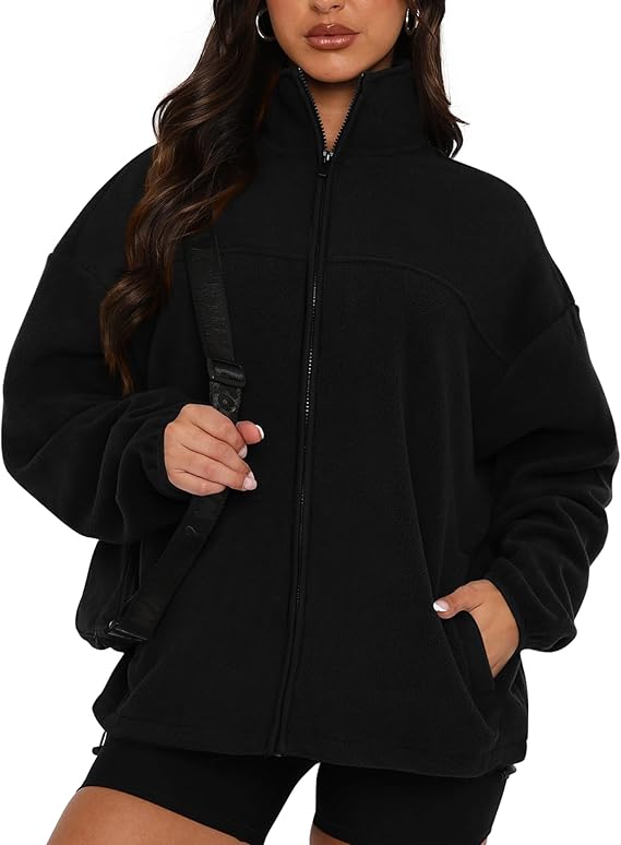 Women's Zip Up Fleece Jackets Stand Collar 2024 Fall Winter Outerwear Casual Fuzzy Coats with Pockets