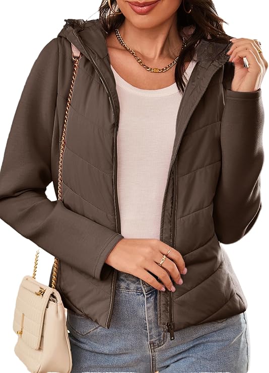 Women's Warm Quilted Lightweight Puffer Jacket Slim Fit Elasticity Patchwork Casual Hooded Puffer Coat